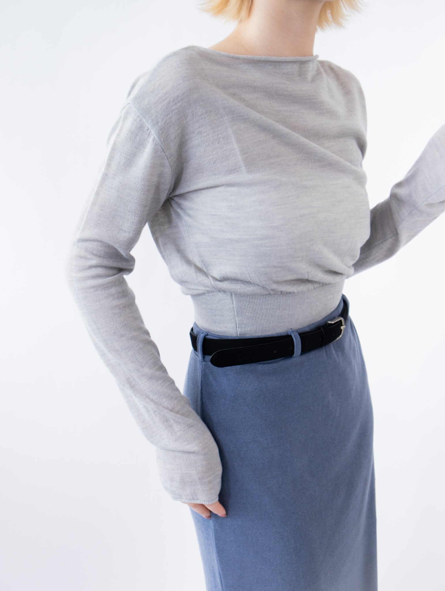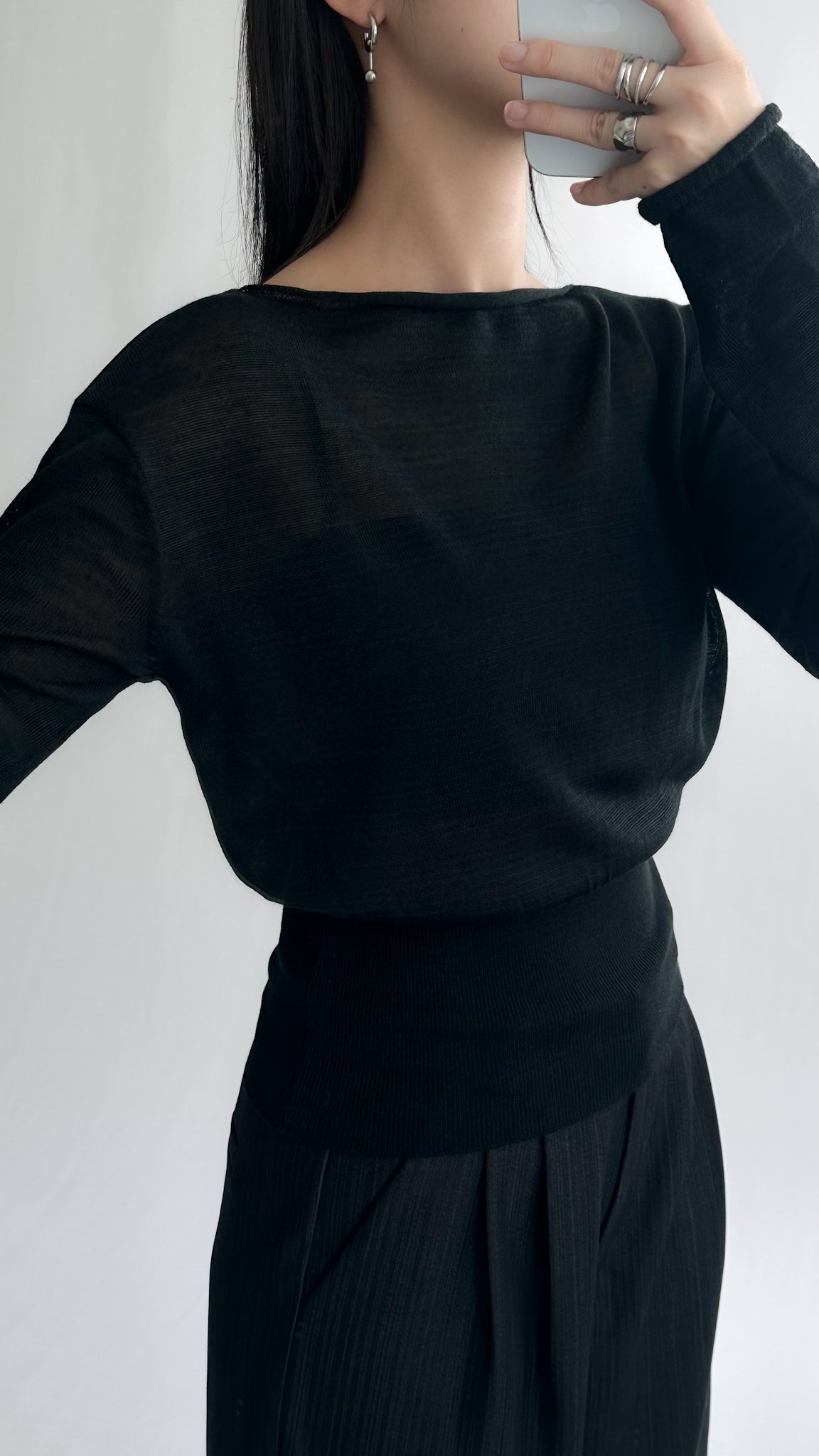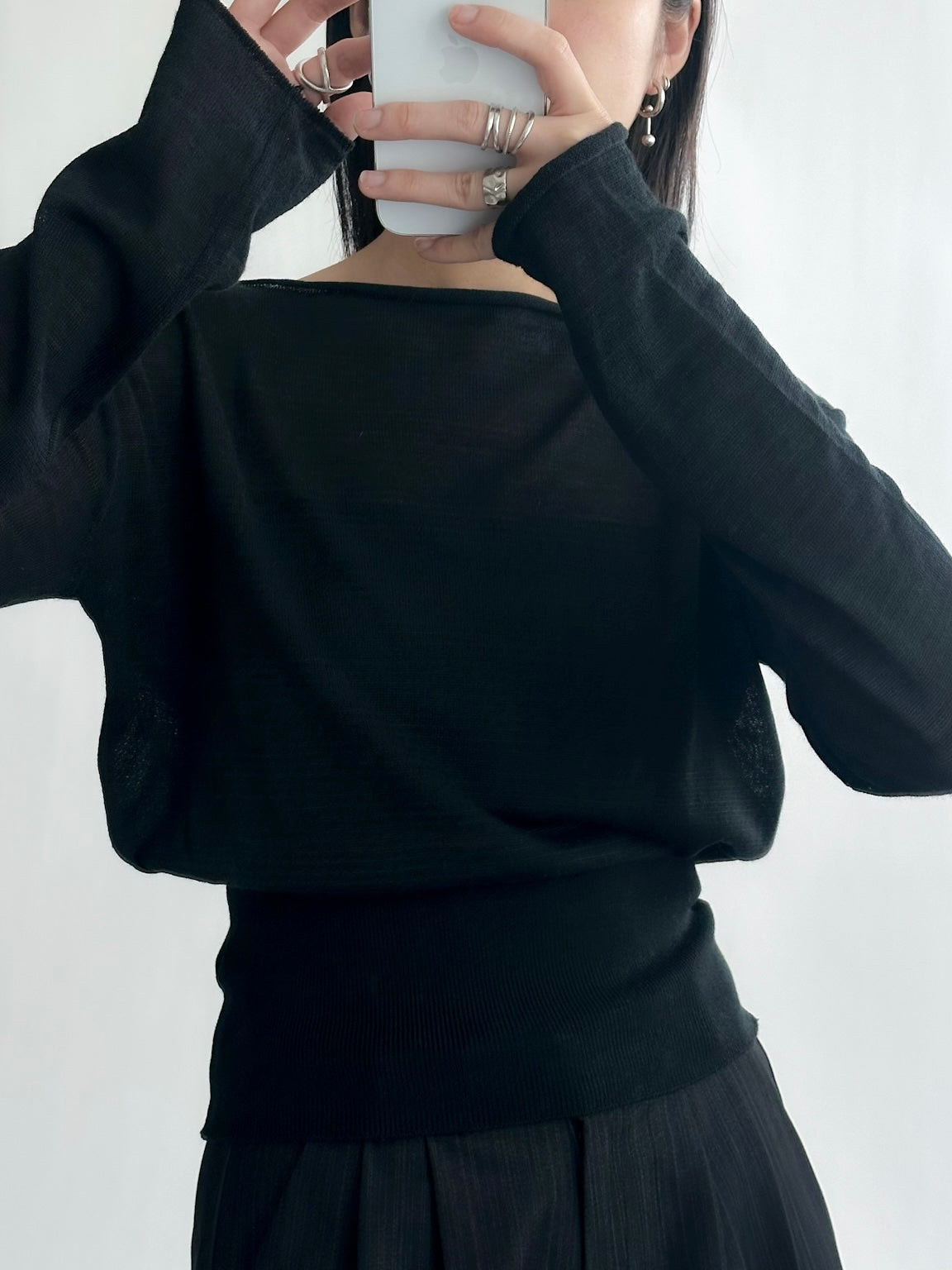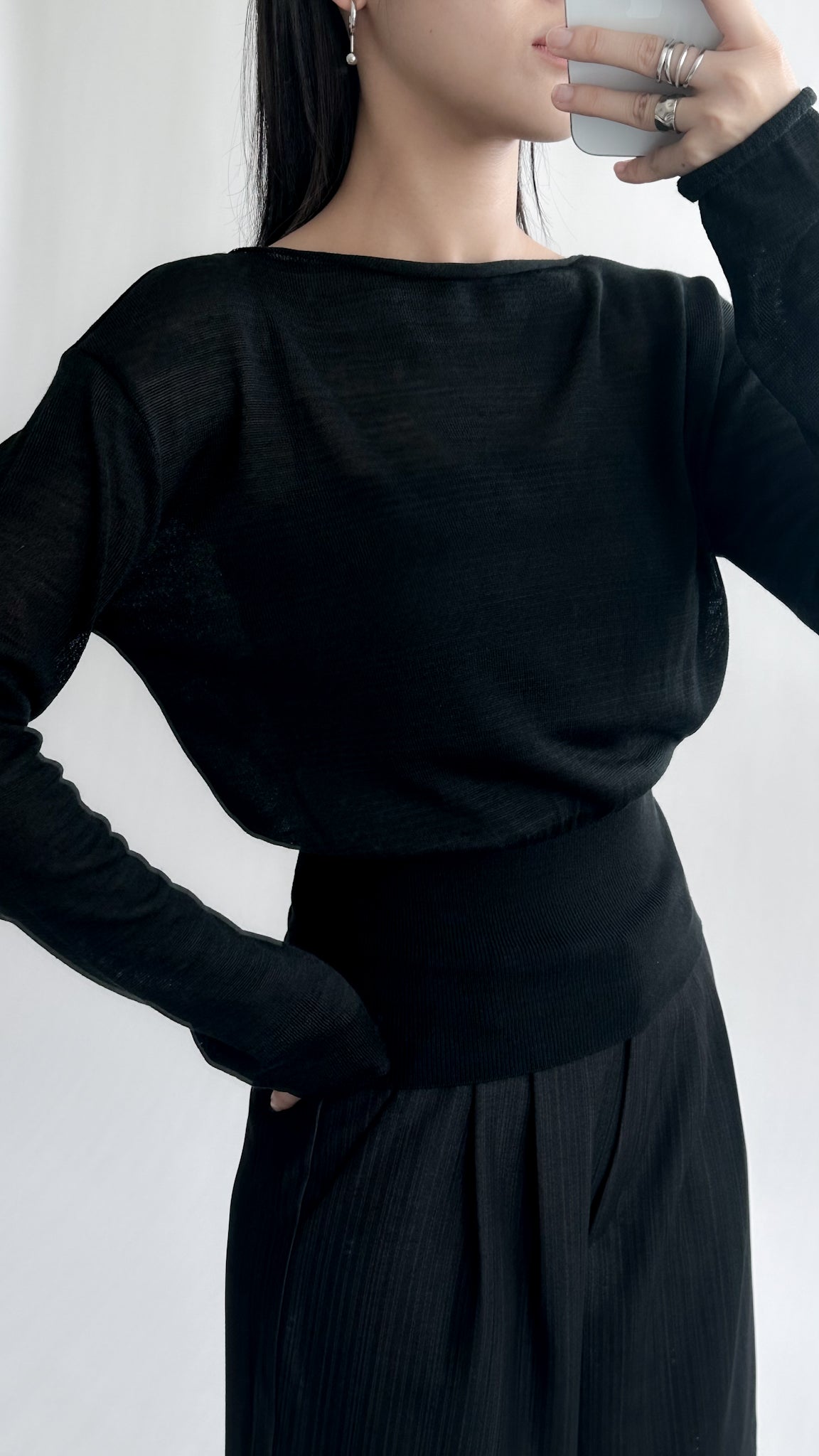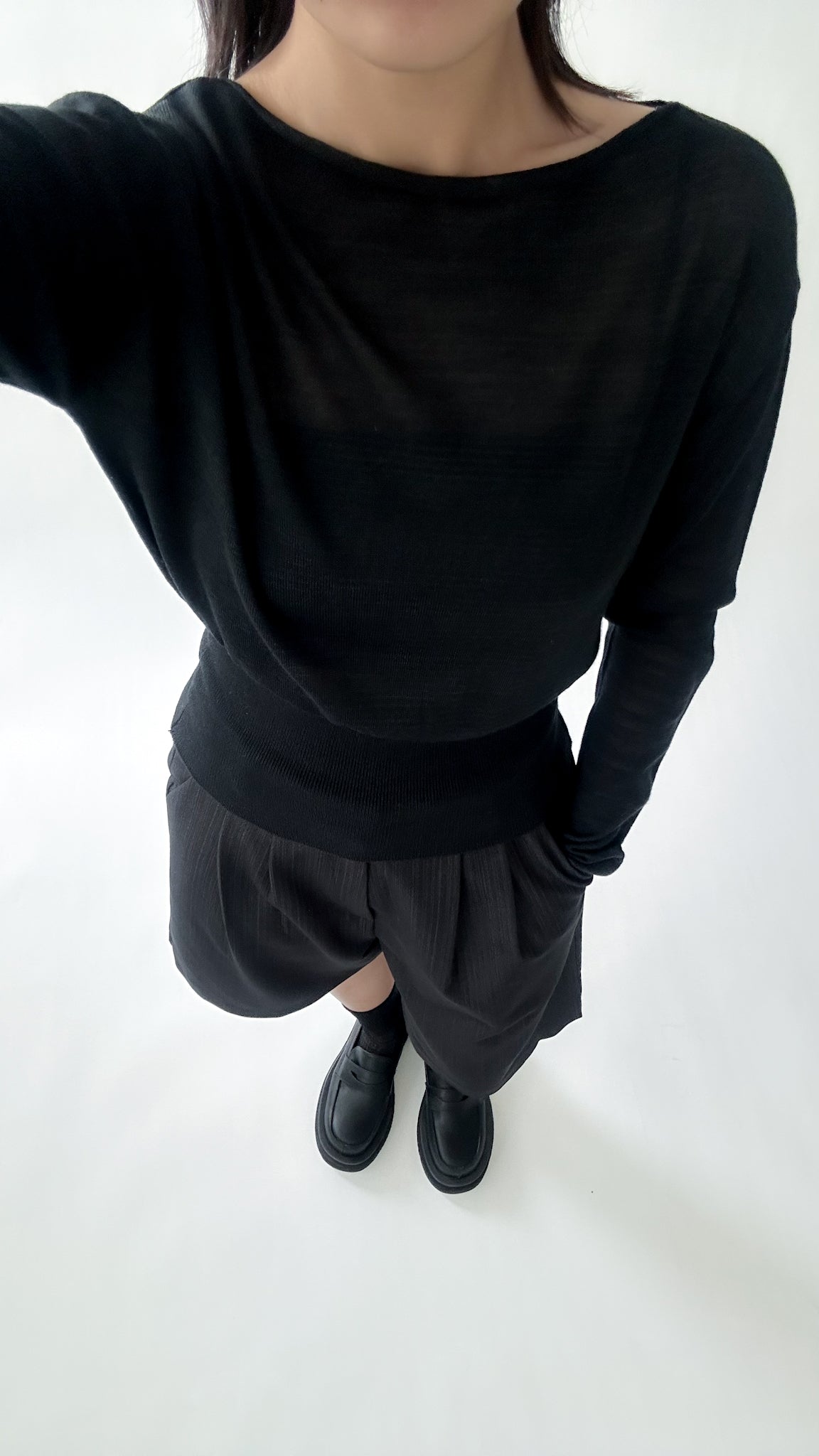 一字領束腰薄冷衫 - 黑色