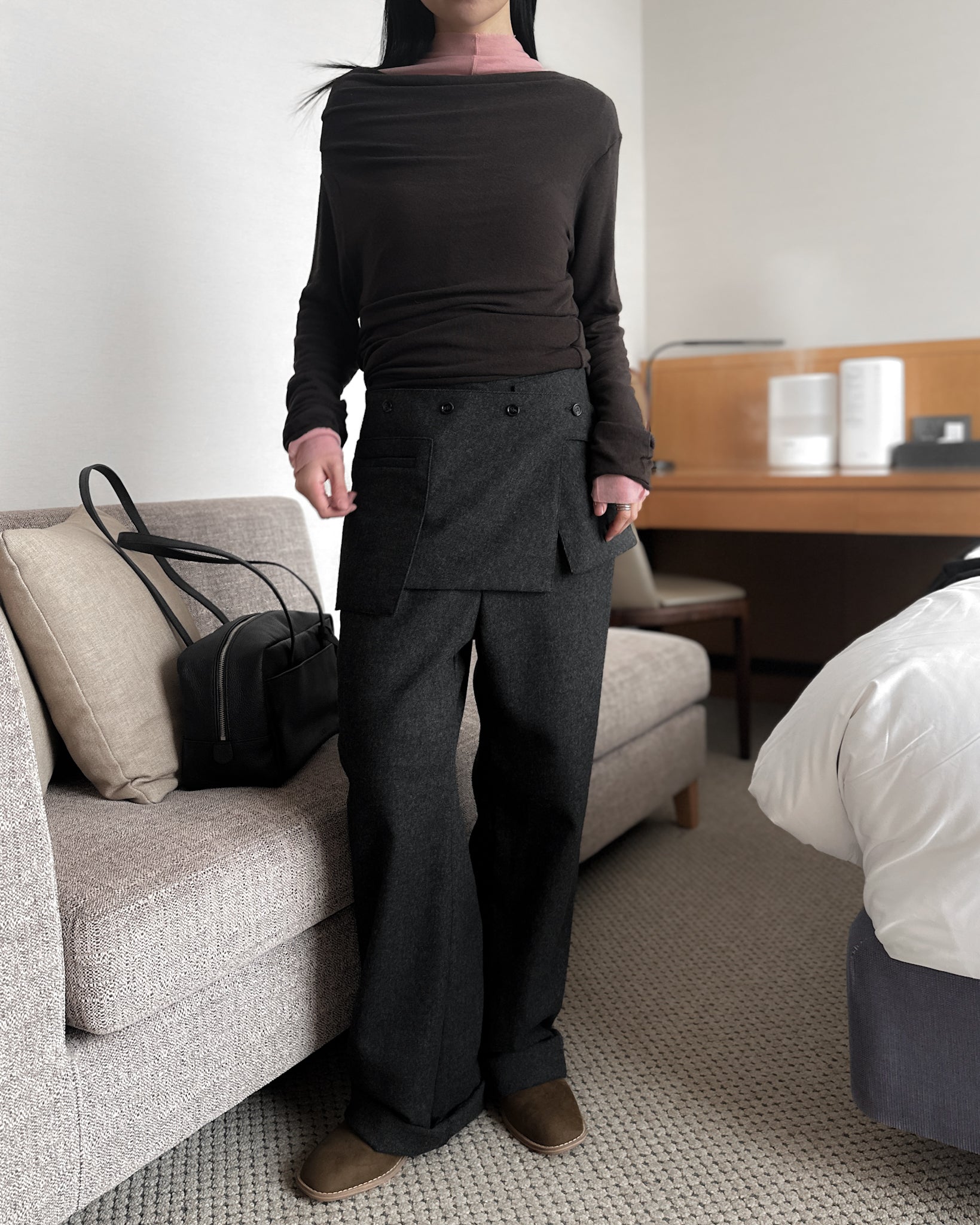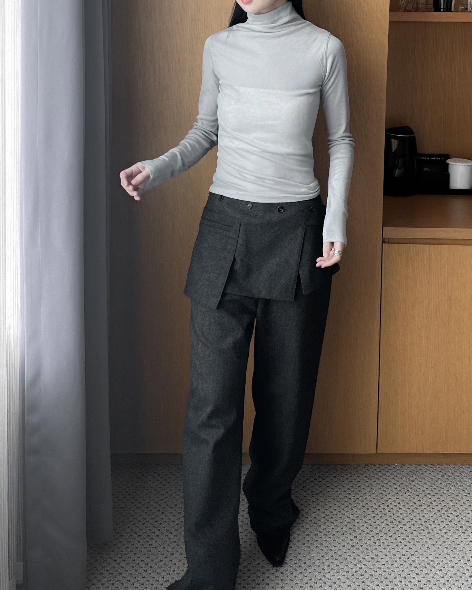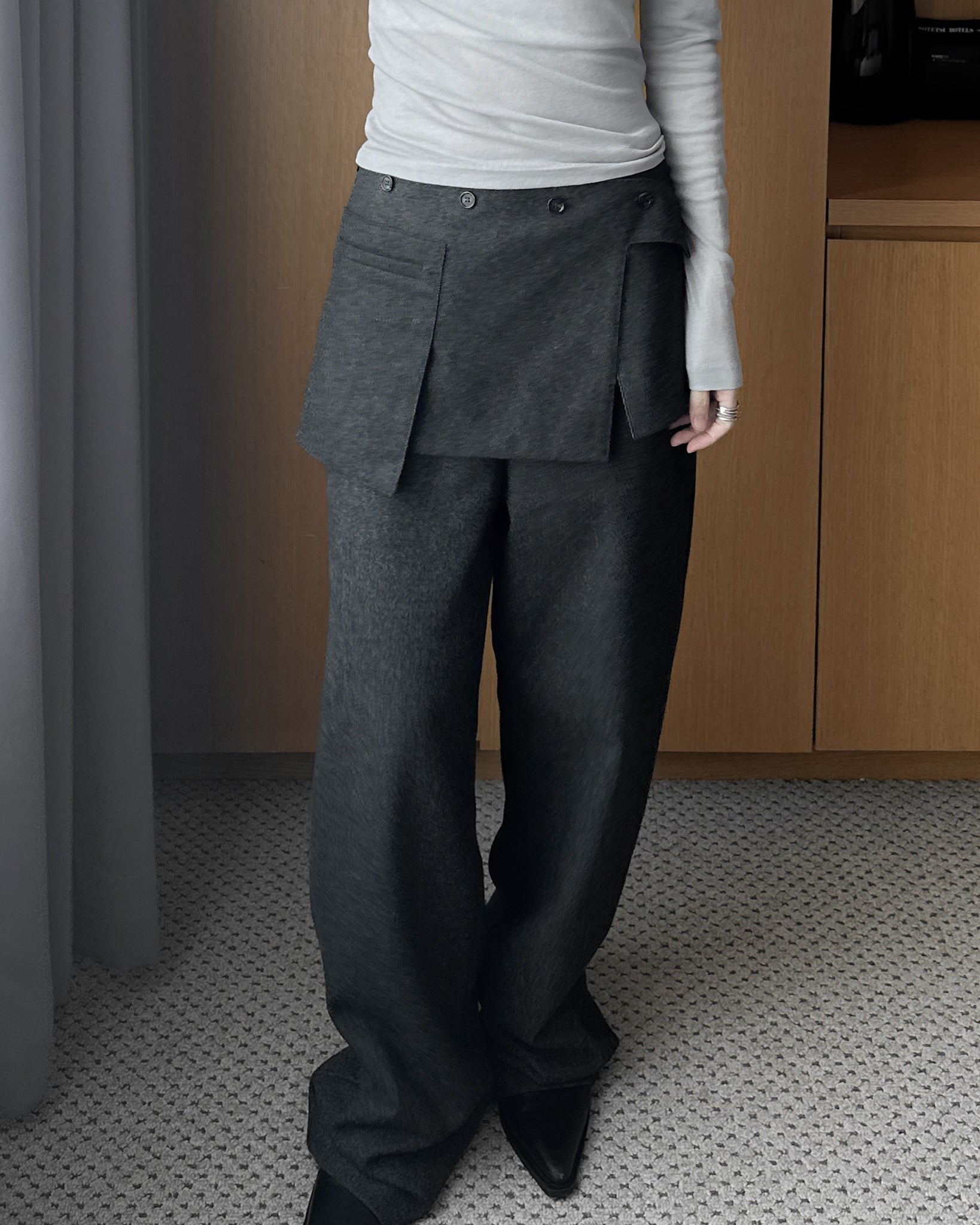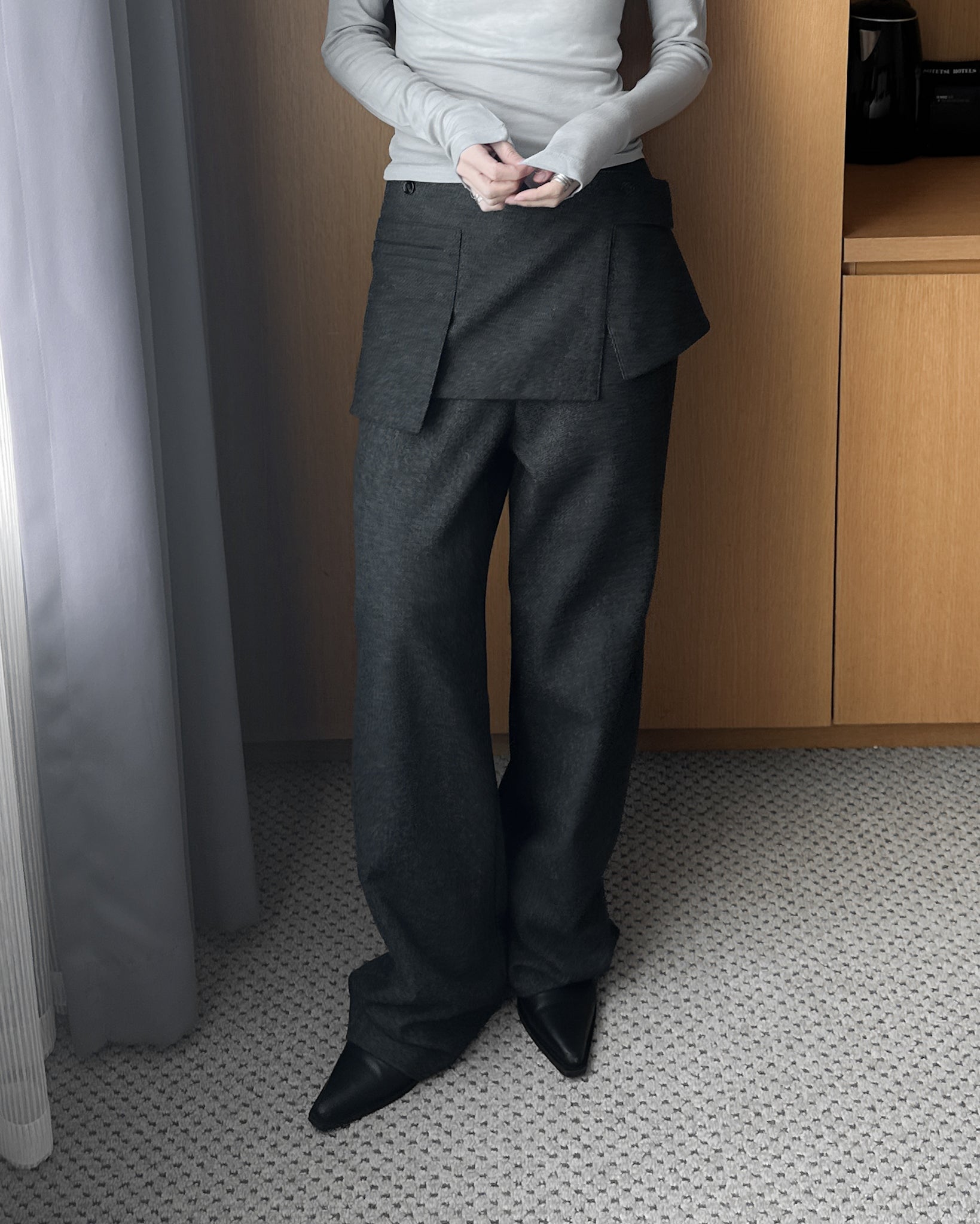 (可拆式裙片)薄羊毛直筒長褲 - 深灰色