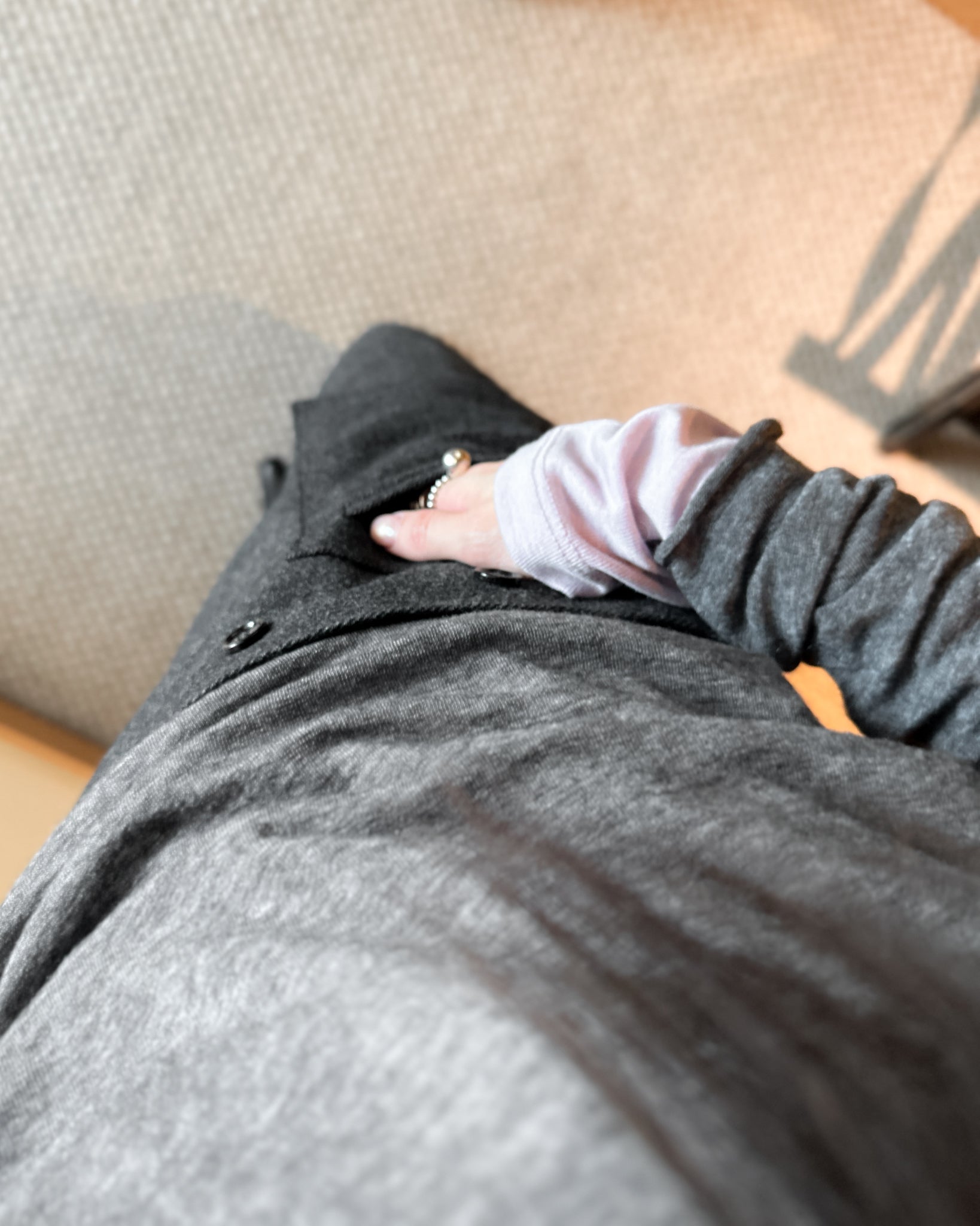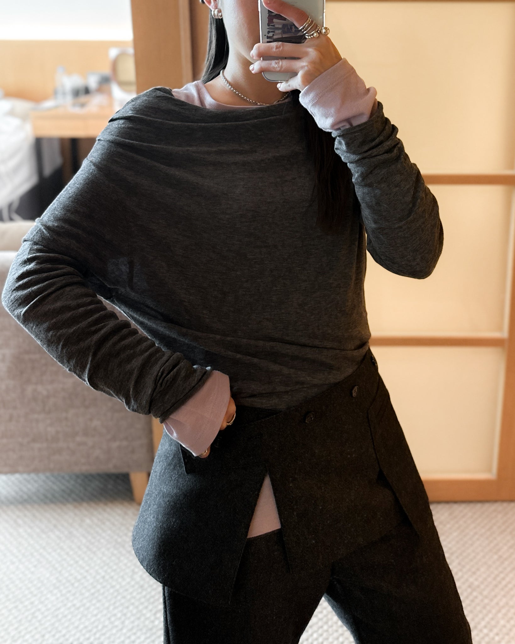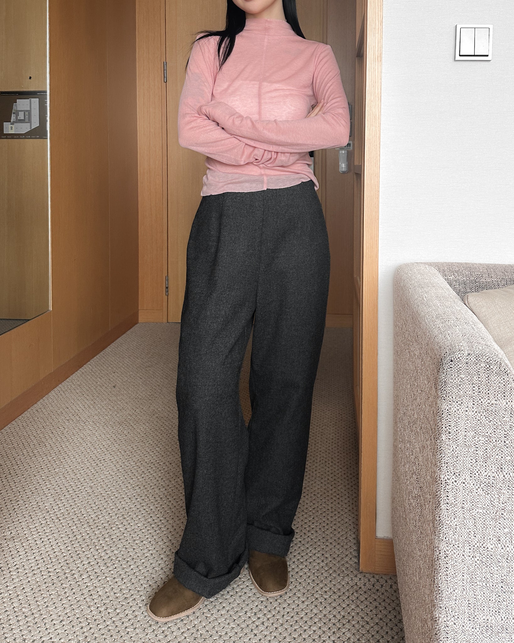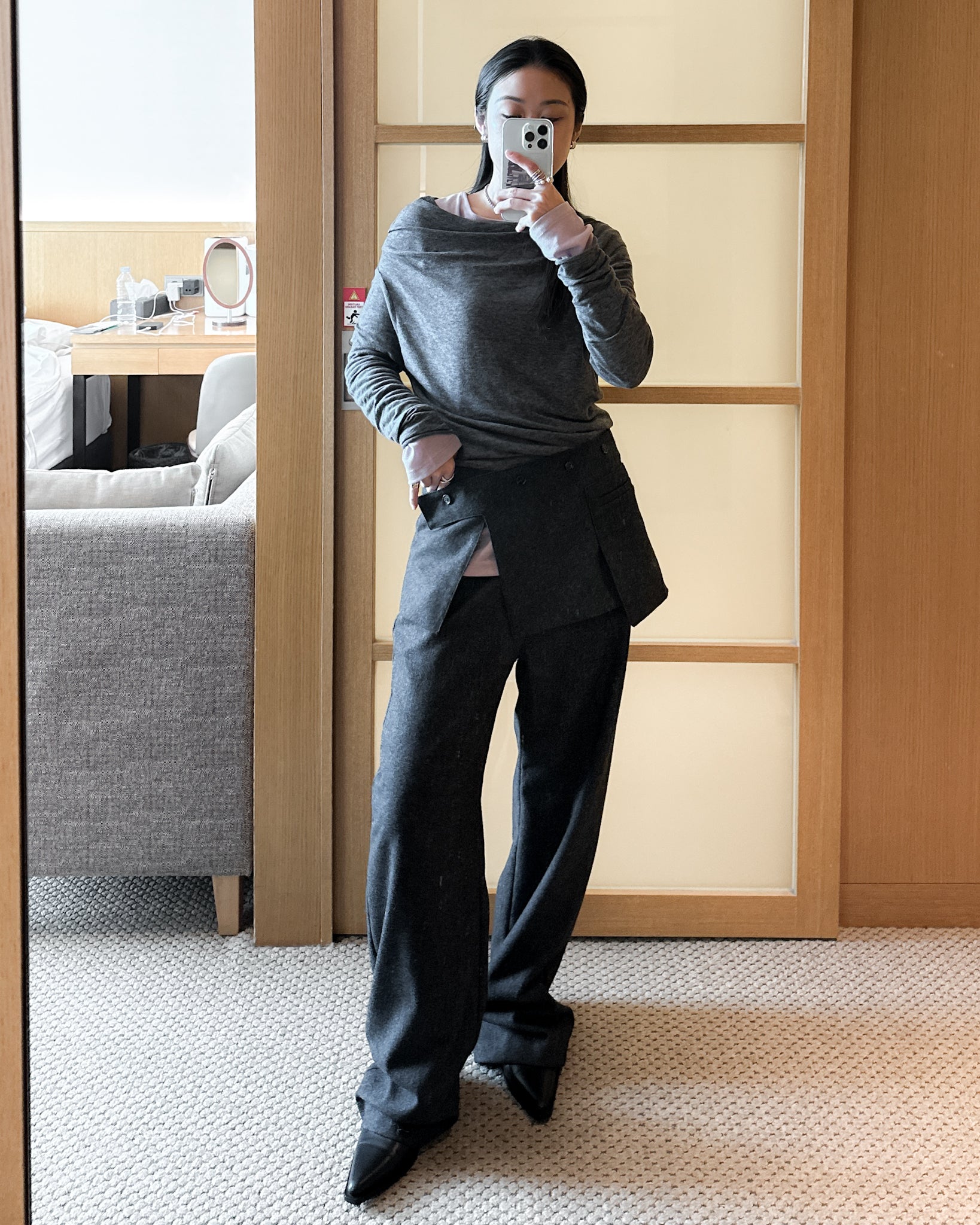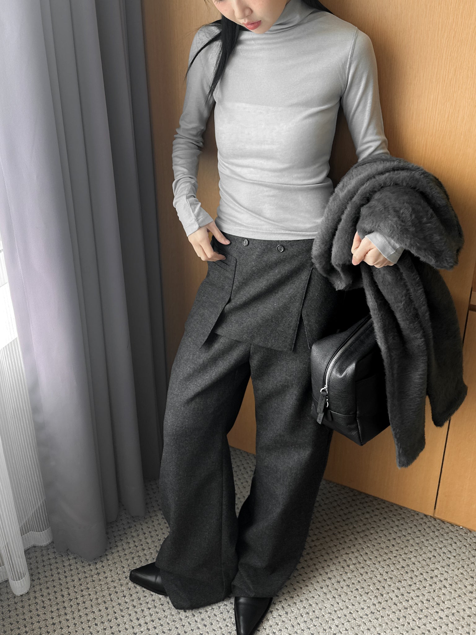 (可拆式裙片)薄羊毛直筒長褲 - 深灰色