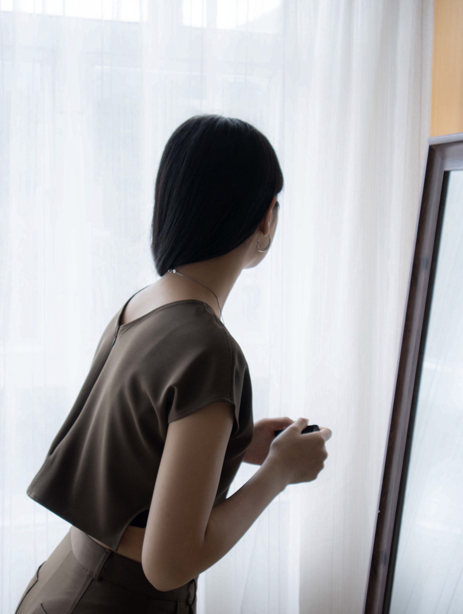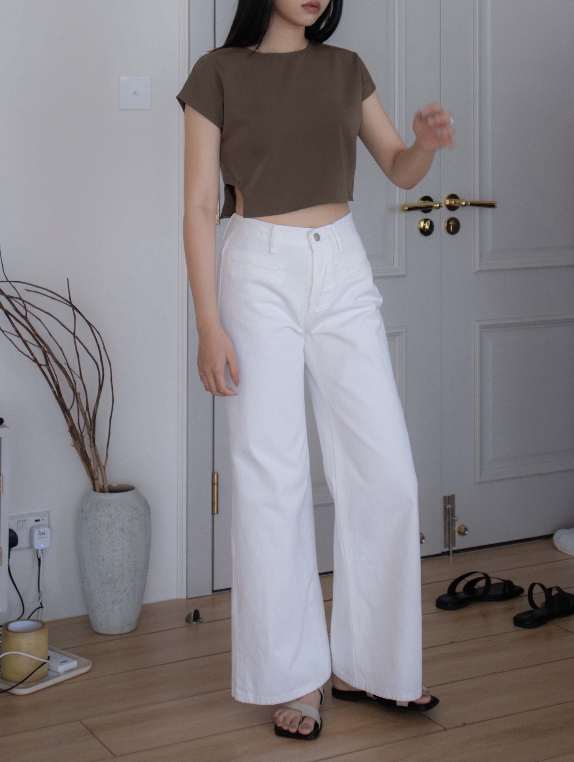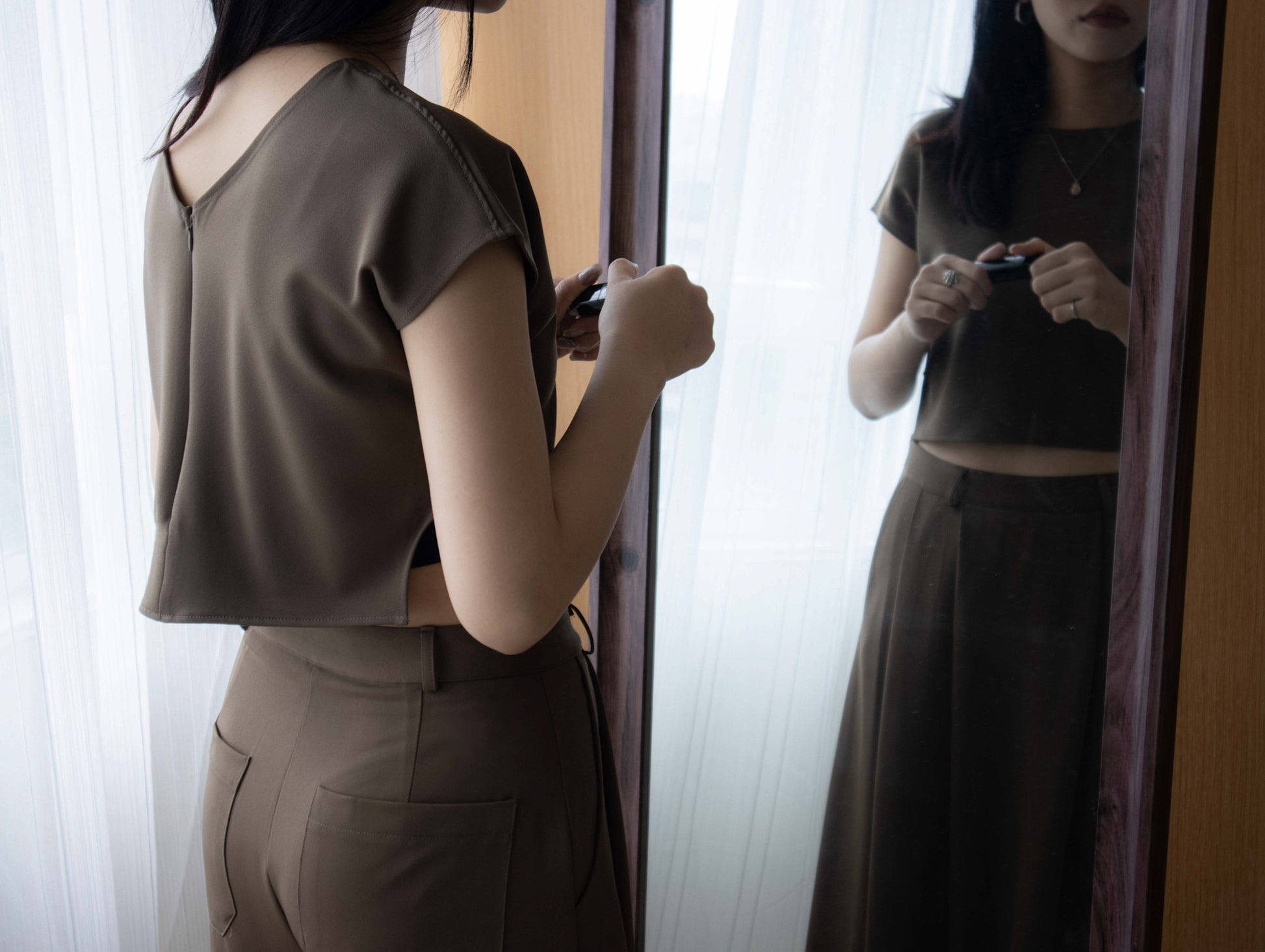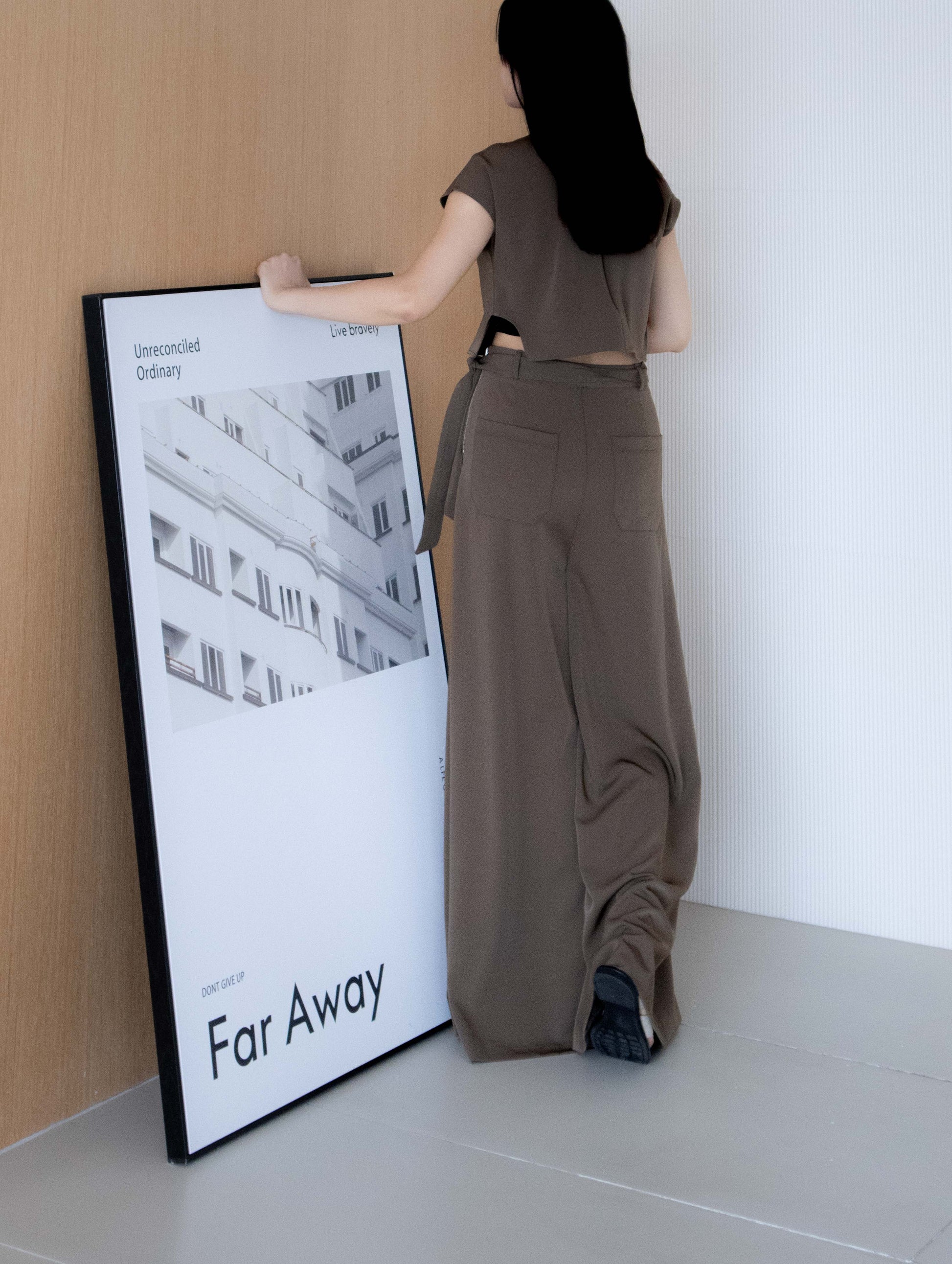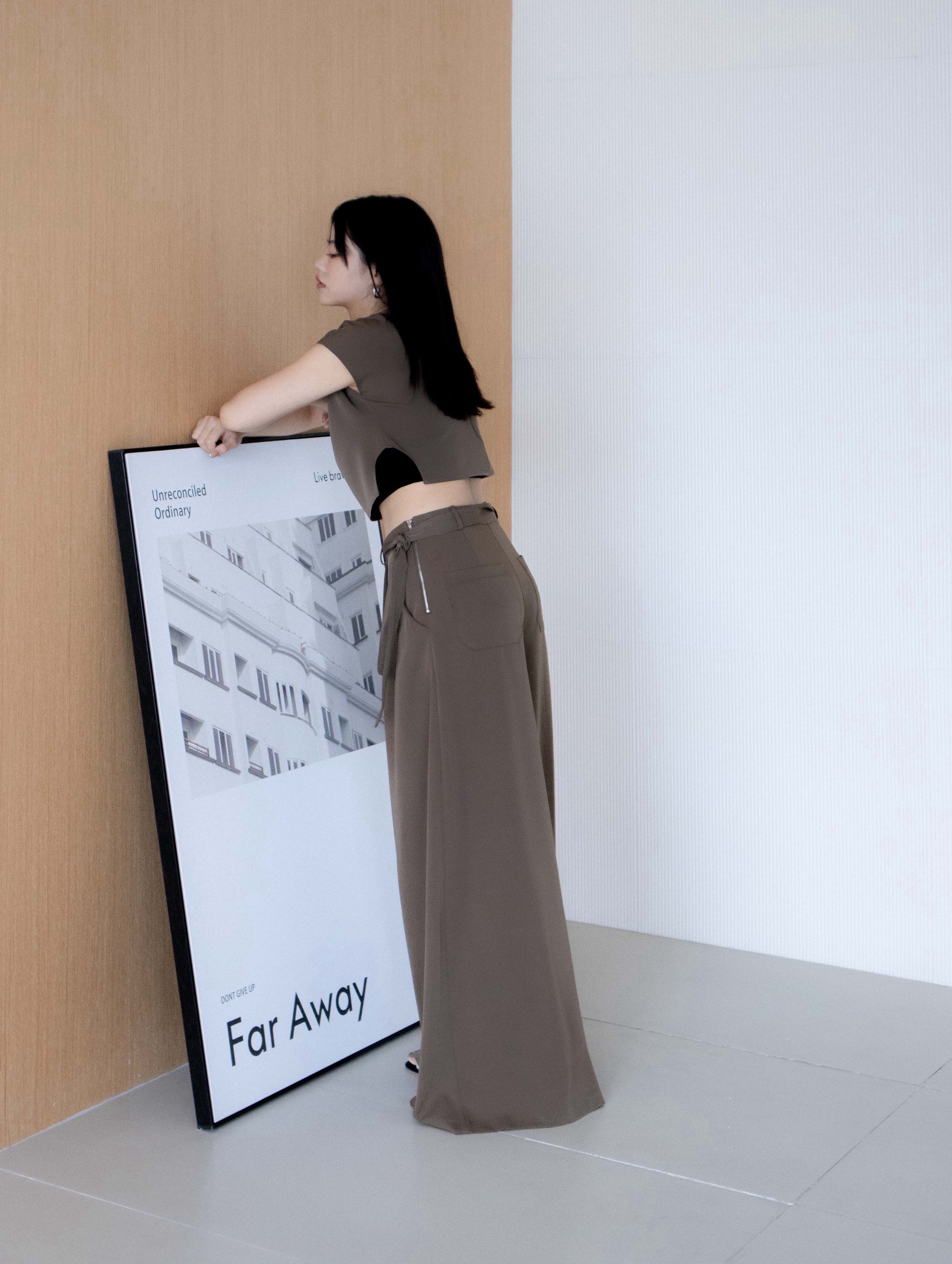 • 兩側做U形露腰設計,正面視角下比較低調,亦不過份暴露。但V領當背面穿,從側後視角來看的背影線條以及下擺立體度非常明顯。