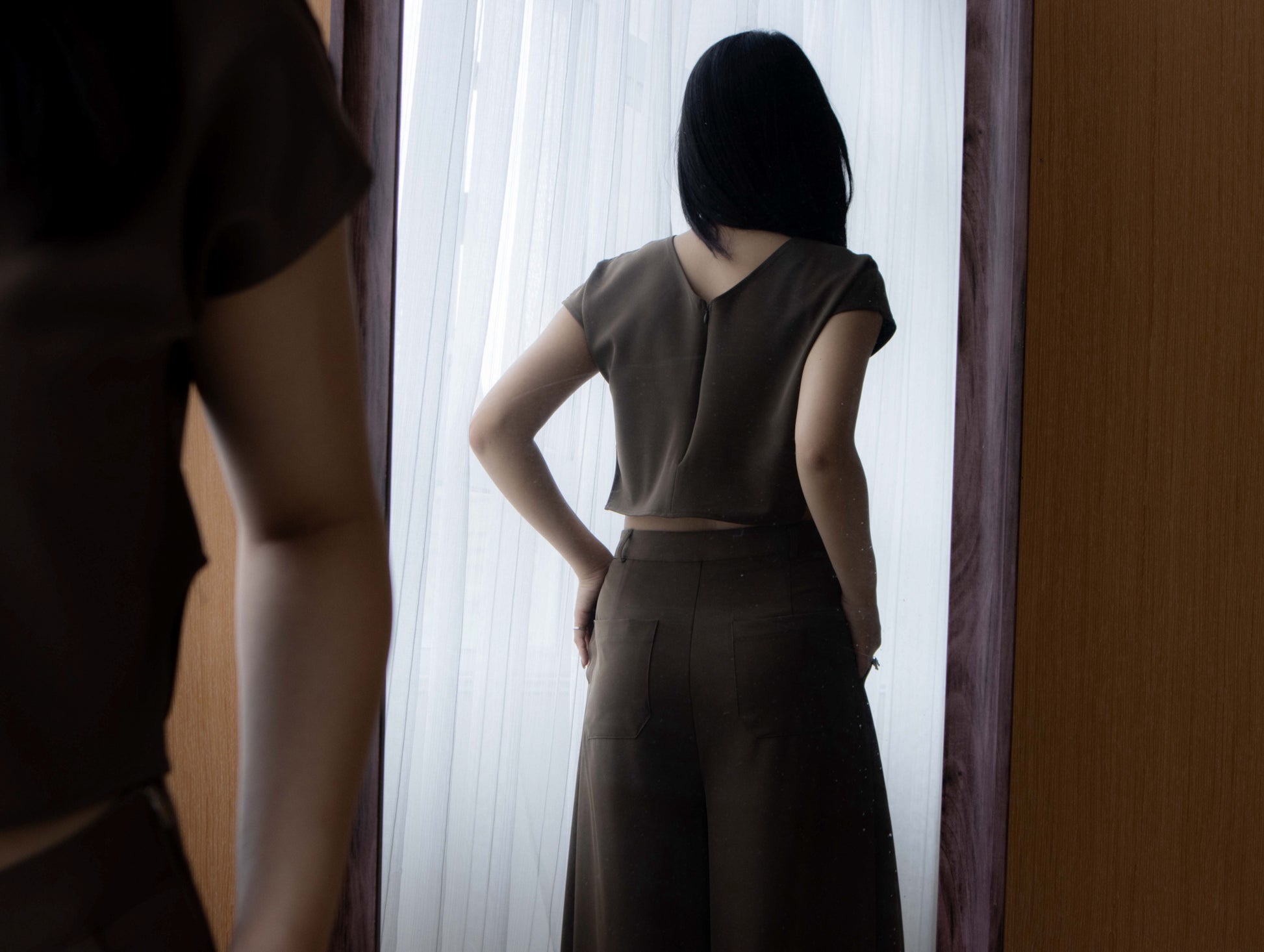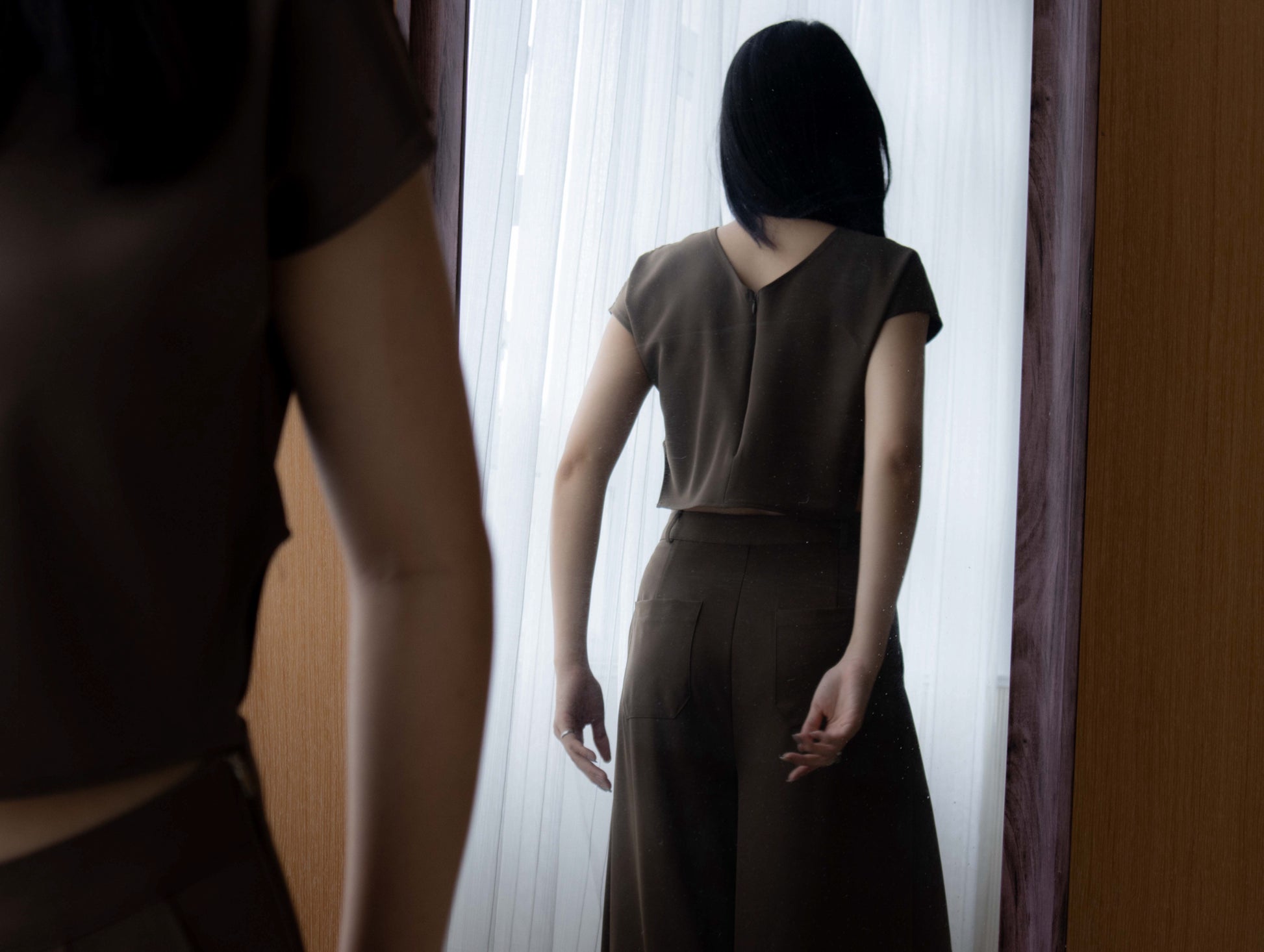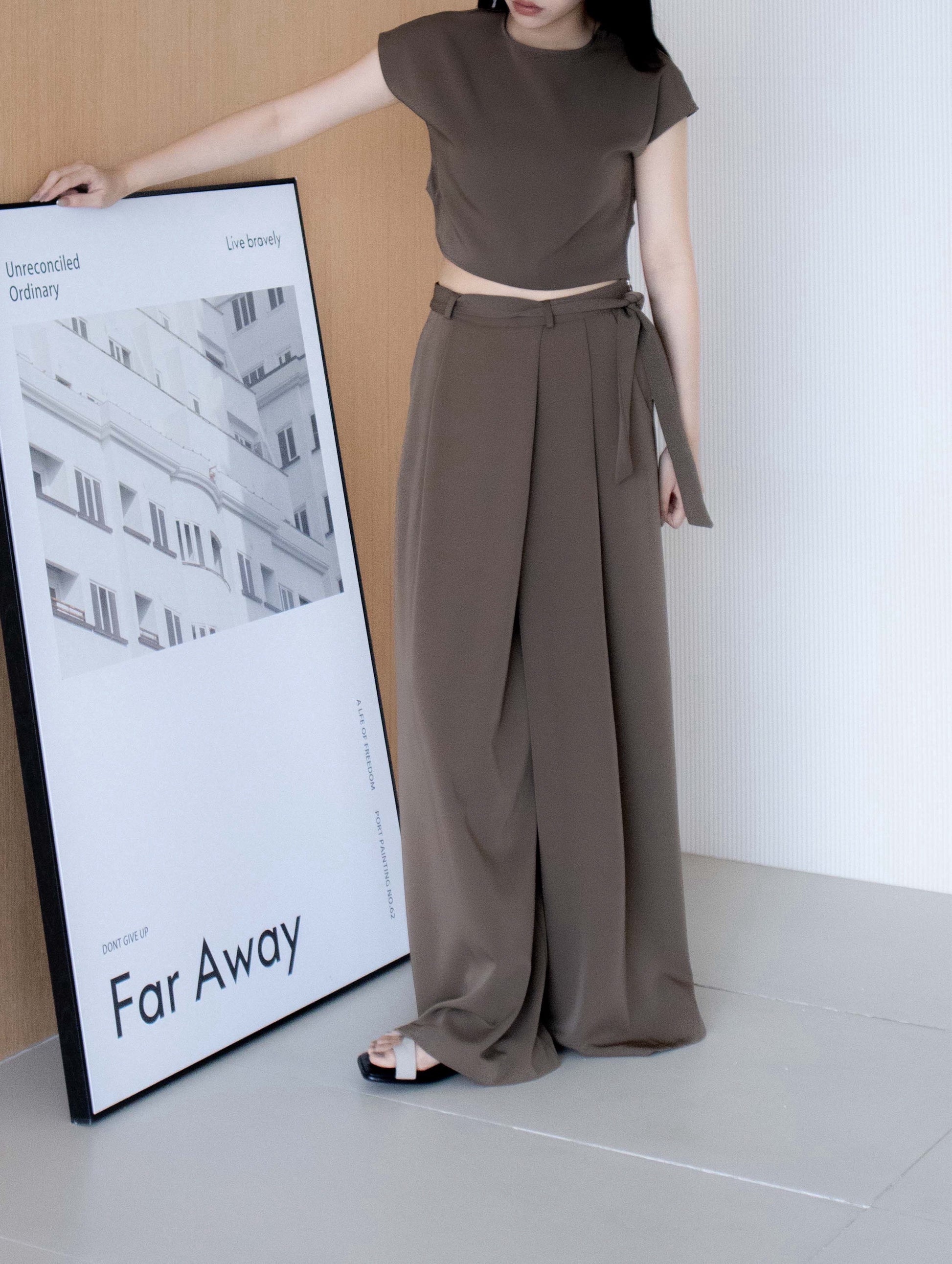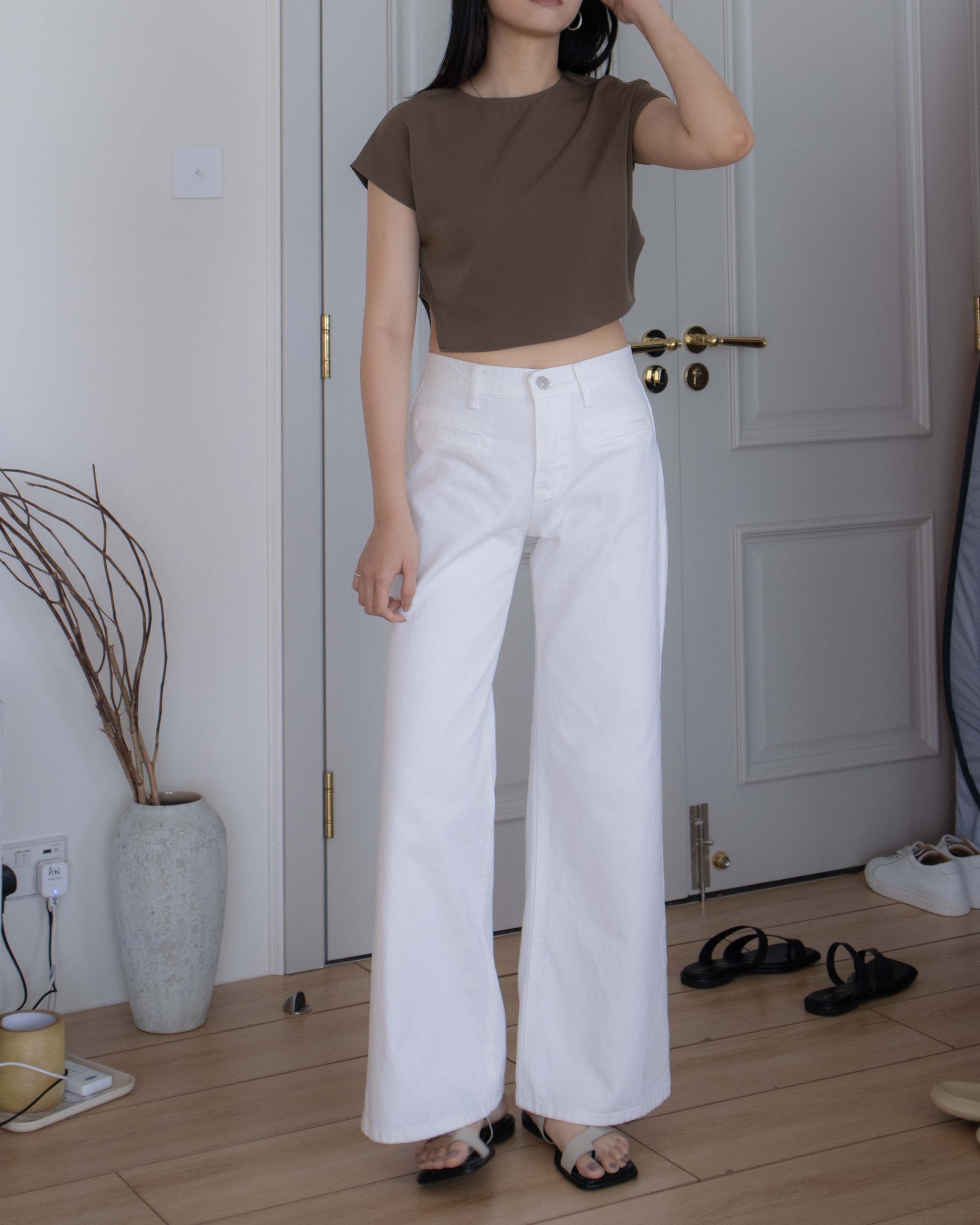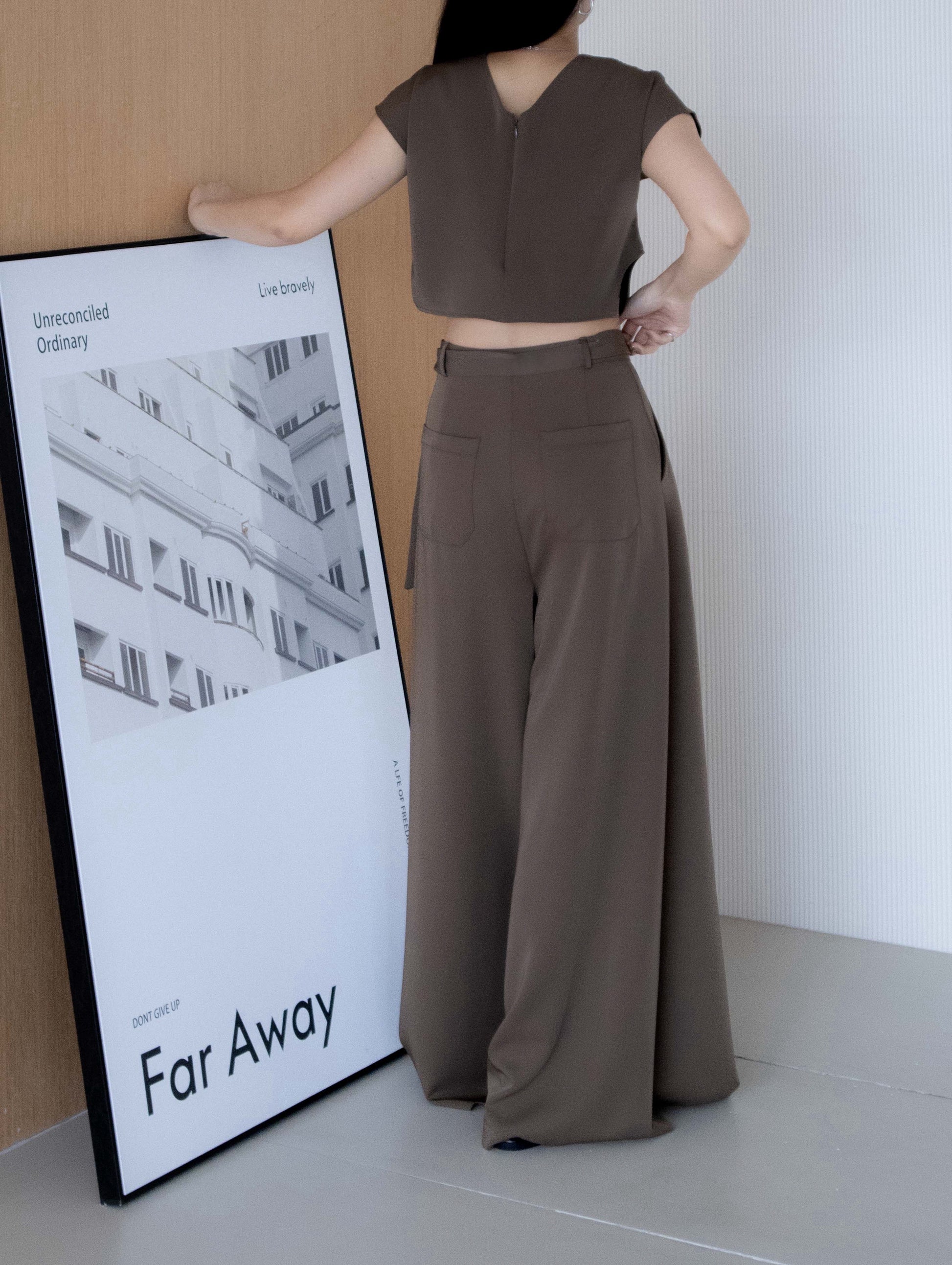 • 兩側做U形露腰設計,正面視角下比較低調,亦不過份暴露。但V領當背面穿,從側後視角來看的背影線條以及下擺立體度非常明顯。